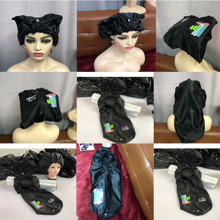 Poderia o LOGOTIPO personalizado na capota, fixação do preço baseada sobre pelo chapéu personalizado cor do sono da noite do cabelo encaracolado com as capotas do cetim do BOTÃO Cuidado da beleza e chapéus da ferramenta do resto do salão de beleza, capotas feitas sob encomenda